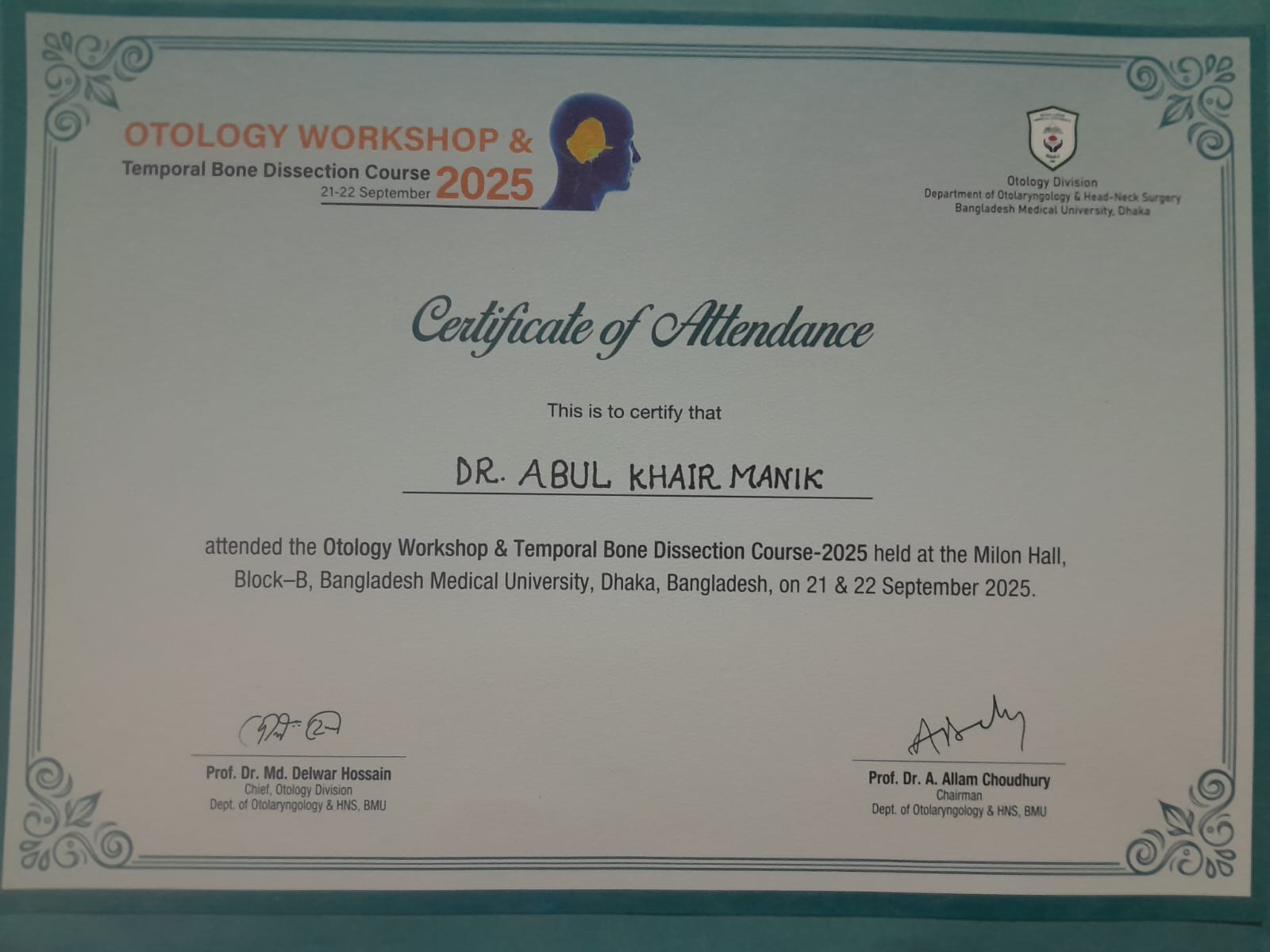 Dr. Abul Khair Manik is an ENT specialist from Cumilla, Bangladesh. He completed MBBS from Dinajpur Medical College and joined government service through the 42nd BCS (Health).